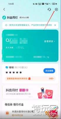 第四步:进入抖音月付主页,用户需要点击右上方齿轮图标,该图标为抖音月付的设置选项。
