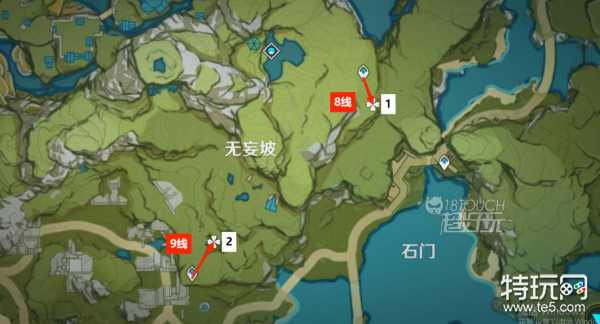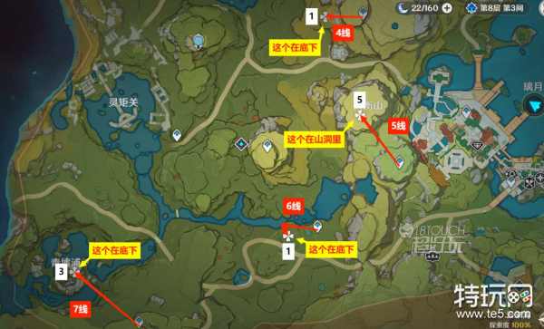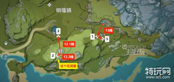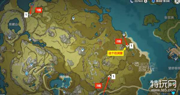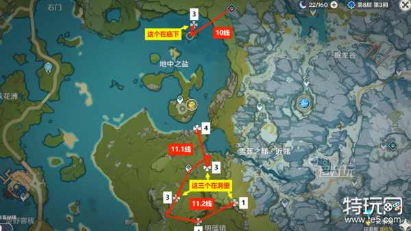 1、采集路线1-3如下图所示,一共可以收集3个夜泊石。传送到对应传送点后按照红色箭头方向前往对应地点寻找材料;
