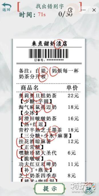 以上就是特玩小编整理带来的抖音小游戏《疯狂梗传》奶茶店找出30个错别字通关攻略,还没有通关的朋友,不妨来看看上方的攻略参考一下!