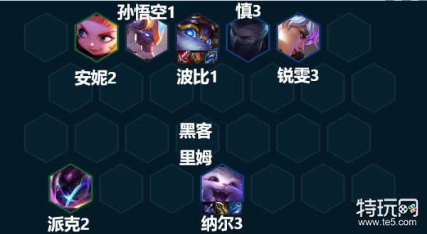 三至高天的效果是:召唤一个扎克,扎克会复制距离它最近的至高天单位的另一羁绊。烬的另一个羁绊是混沌战士、薇古丝的另一个羁绊是吉祥物、派克的另一羁绊是黑客。在这套阵容里,我们需要让扎克复制烬的混沌战士羁绊,方便我们开出3混沌战士。