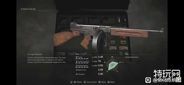 武器汤姆逊冲锋枪(Chicago Sweeper)的特点就是无限子弹,射速极快,不过伤害从10点削弱到了2点,说实话原版10有点太夸张了 ,我觉得减一半都可以,这个2确实有点低了。