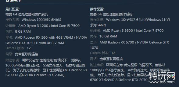 按照官方给出的建议,运行游戏的最低配置为,CPU需要锐龙3 1200、酷睿i5-7500,8GB内存,显卡要RX 560、GTX 1050 Ti,要求不高。这个最低配置说的是在性能优先的情况下,1080p下能跑45fps。