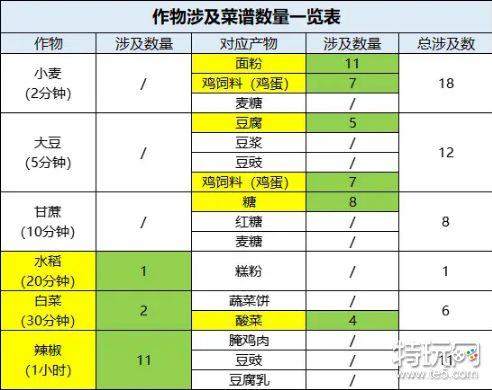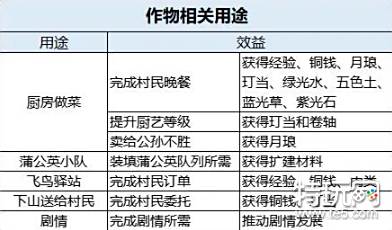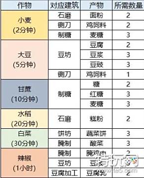 各种农作物的种植时间和其用途都是不同的,这里给出由玩家整理出来的种植时间和应用表,这其中前四种是初始就能种植的作物,后面的白菜和辣椒是需要到达11级和13级才能分别解锁。