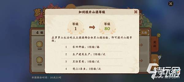 而在山遇玩法内,玩家们可以看到更多不同的任务,每一个任务都是很重要的,会有独特的完成渠道,玩家们只需要按照流程介绍去完成这些任务,例如安装更多的农田,提升舒适度都是可以获取山遇的经验值,当经验值达到标准之后就能提升山遇等级,等级每提升一级都可以解锁对应的青田玉坠。