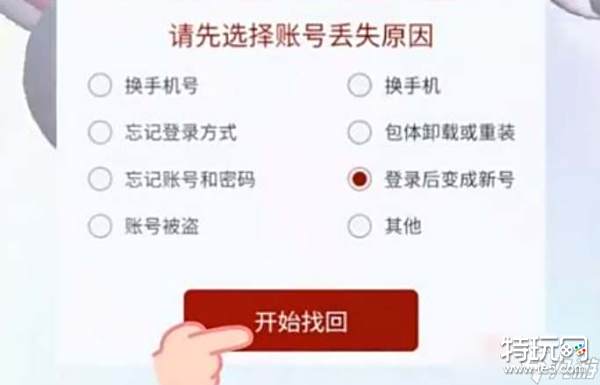 2、在登录界面找到下图所示的【账号找回】按钮 ,点击后会打开一个菜单,选择【登录后变成新号】