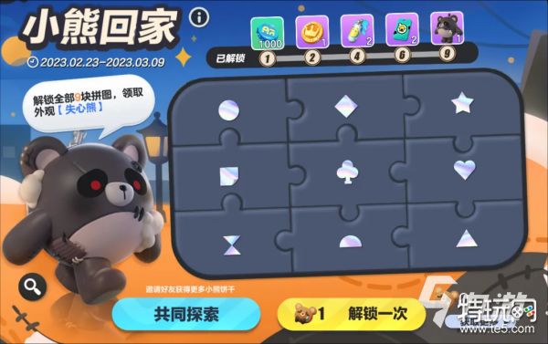 一共需要各位将九块拼图全部解锁才可以,全部解锁之后就可以直接领取这个装扮了。通过任务各位就只能获取到四份饼干,但是各位如果再邀请好友一同进行探索的话,那么就能获取到额外的道具,不过通过这个方式最多只能获取到五份饼干。