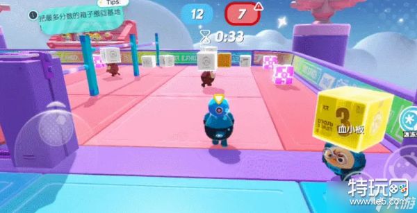 1.巧用道具运箱子,干扰对手夺胜机比如在搬箱子这种积分赛中,场地会有一些道具可以让我们进行高段跳跃,为了胜利,这种时候我们要快速布置道具,让自己和队友都能快速搬运方块得分。