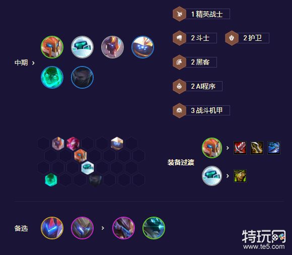 如果有AI转或者机甲转,7人口直接开出4AI或者5机甲那就更好了,有对应转职开对应羁绊,AI差就优先开机甲。都没有就挂点质量牌也行,5费啊,怪兽龙王啥的先用着。一般就挂派克,没有提升点就7级继续慎,武器,猴子,机器的3星更好。有5机甲或者4AI的大提升再升8提升出来再追3星质量,数量少都追不了了才上9。