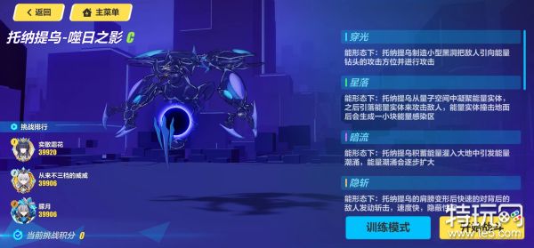 托纳提乌—噬日之影又被称为量子龙虾,是量子属性boss,其在3s化后无论是技能动作和机制都变的非常炫酷,并且其大部分攻击都可以通过近战攻击招架弹返,打起来也是非常痛快的一个boss,在招架弹返特定攻击一定次数后其会拾取一次量子盾,量子盾全部消失后会进入坍缩模式。