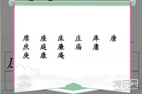 1、开局就发现文字有广十,在结合生活中所见的文字,可以找到:席、座、床、庄、库等。