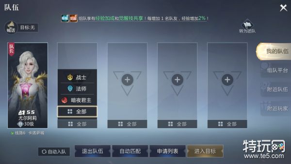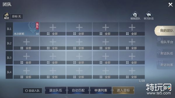 玩家可在左侧根据自己准备参与的副本、首领、活动选择自己的组队目标,然后在列表上申请加入队伍,或自动匹配加入自己需要的队伍。