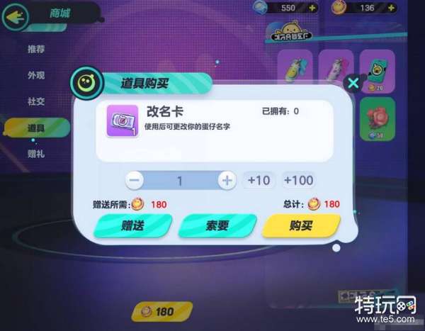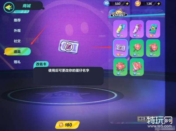 3、最后在道具功能界面中,找到道具改名卡,需要花费一百八十个蛋币(18元人民币),支付成功就可以了。