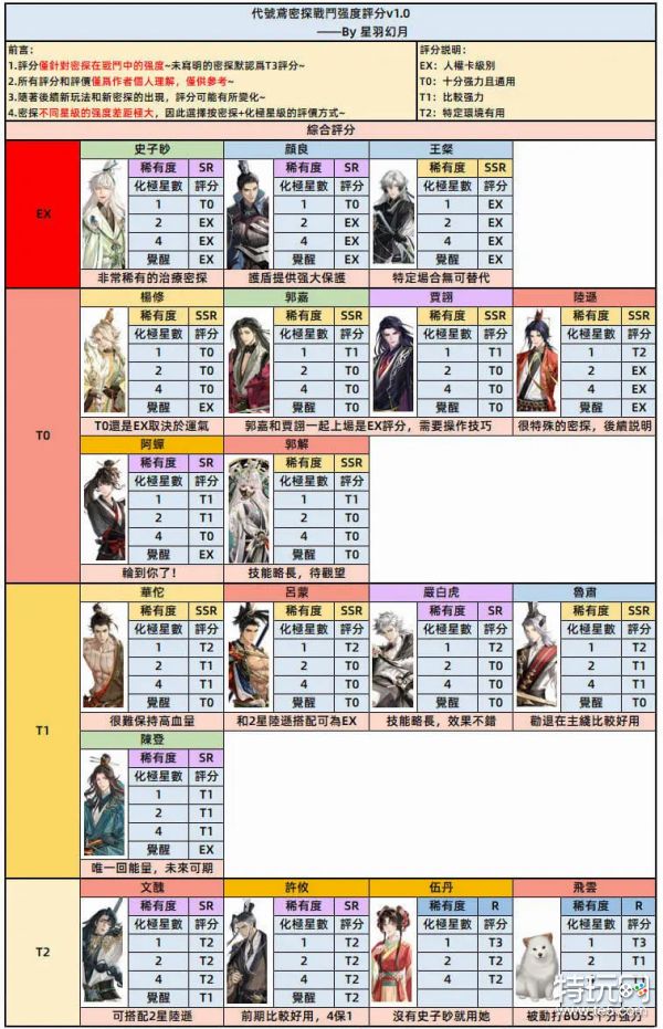 评分 角色 稀有度 EX 史子眇 SR 颜良 SR 王粲 SSR T0 杨修 SSR 郭嘉 SSR 贾翎 SSR 郭解 SSR T0.5 阿蝉 SR 陆逊 SSR 吕蒙 SSR 陈登 SR