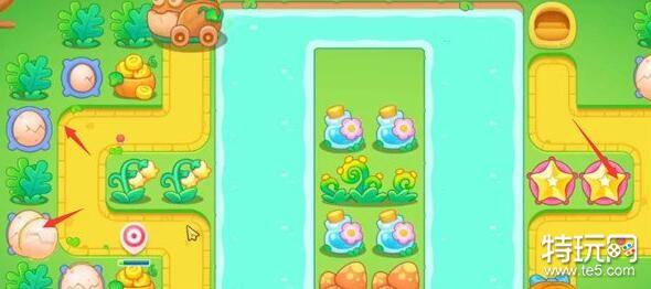 5、在如图所示位置放置一个毒针塔,在图中央放置两个星星塔,毒针塔可以对兔子造成减速和持续伤害。