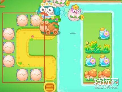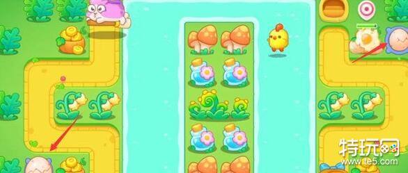 1、在如图所示位置放置一个大鸡蛋,并将大鸡蛋升至满级,并在箭头位置处放置另一个大鸡蛋,增加我们清理障碍的速度