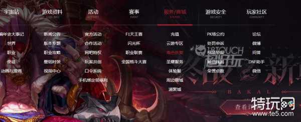 1、玩家前往DNF官网,选择上方的【服务/商城】在下方可以找到【角色恢复】功能页面。