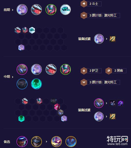 前期尽量用强势棋子与羁绊打工,保证打工棋子2星,进而稳定血量健康,步入7与8阶段,7与8阶段低费打工卡向以4-5费棋子为核心阵容转型。