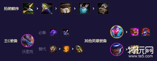 狼人春哥必备,其他ad装备捡垃圾都可以,铁男带法强装或肉装捡垃圾也可以,卡牌带电刀减魔抗。若是铁男装备满了或者卡牌先2星,可以把法装先给卡牌。