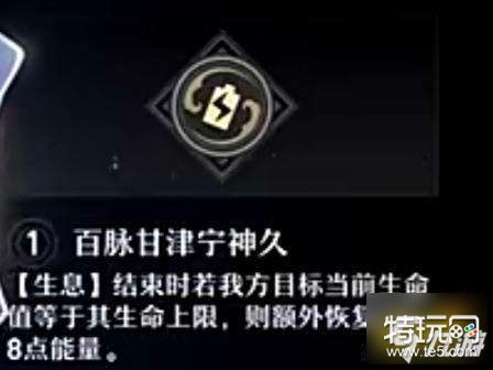 [生息]结束时,我方目标当前生命值等于其当前生命值上限(就是血量百分百,没掉血),则其额外恢复目标8点能量。