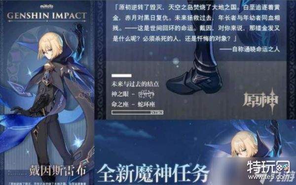 戴因斯雷布,坎瑞亚末代宫廷卫队队长。坎瑞亚覆灭,而他也深受诅咒获得不死之身,不屑于神的庇护,同时也在阻止深渊教团的一些极端行为。在官方的立绘中,戴因斯雷布拥有名为“蛇环座”的命之座,神之眼则是一团不知何意的符文,也许是独立于七神之外的体系?来自深渊的力量?有考究说,蛇环座代表环尾蛇,象征循环。