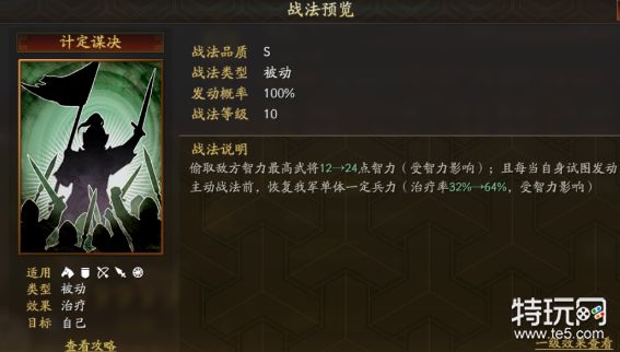 2.SP刘晔的自带战法【计定谋决】具有强大的辅助能力:在准备阶段即可削弱敌方智力最高的武将,大大限制了传统单核阵容的发挥;并且搭配主动战法时,还能提供源源不断的治疗效果。
