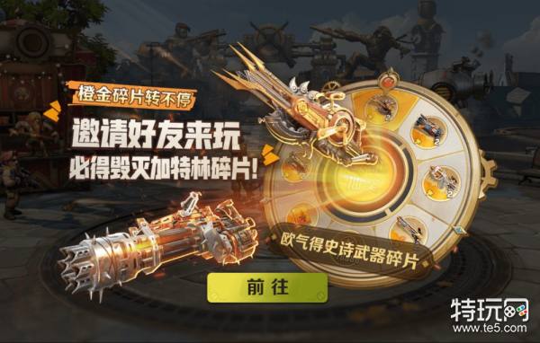 邀好友一起,橙金碎片转不停!邀请新用户必得稀世武器-毁灭加特林碎片,更有机会暴击史诗金武-横断射锯器碎片!集齐一定数量即可兑换整把武器!累计登录三日还有机会赢取整把稀世武器-裂齿射锯器!受邀好友也可获超豪华好礼,快邀好友一起,并肩闯通关!