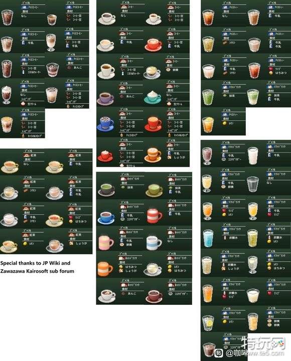 注:本作建筑无相性,只有饮品组合,以及和加料的相性。不建议直接看图开所有饮品,会丧失几乎所有游戏乐趣,推荐自己探索后用本图来补全图鉴。