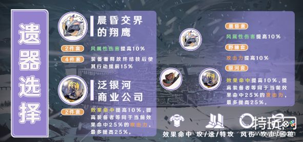 1、桑博遗器的推荐选择为【晨昏交界的分界线】四件套与【泛银河商业公司】二件套,晨昏套套可以为桑博提供风属性伤害提升与行动提前;银河套可以提升桑博的效果命中与攻击力;