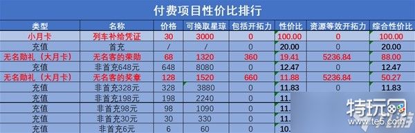 *考虑到购买资源的玩家较少,故以性价比而非综合性价比排序,并提供综合性价比以便参考。因为各个首充可换取的星琼数都是直接充值的两倍,即性价比都是20,所以统一列为首充。