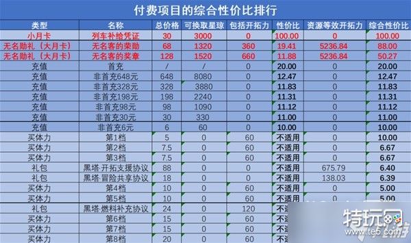 综合性价比高于50的在表内会标红。除大小月卡外,各项目的综合性价比都不超过20,可见大小月卡的性价比非常之高!