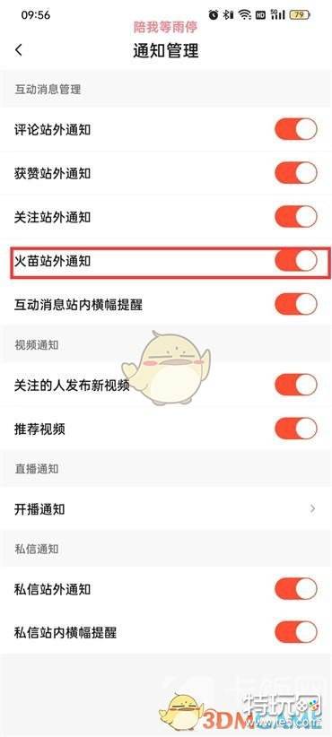 4、找到火苗站外通知功能,开启右侧开关即可。