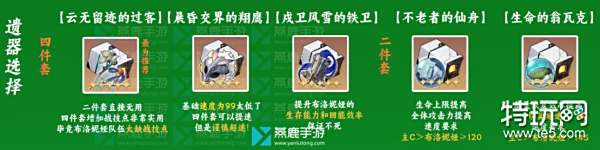 【过客4/翔鹰4】+【仙舟2】:过客2件套效果无用,但是4件套增加战技点非常实用。翔鹰套基础速度99太低了,4件套可以提速,但是谨慎超速。仙舟套能够提高生命值上限,而当装备者速度大于等于120时,我方全体攻击力提高8%。