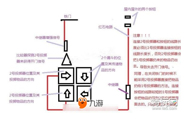 双向门的设计原理就是用一个物品的传输和投掷来实现的,两个投掷器和两个漏斗之间就是靠这个投掷和传输来结合起来,但是需要注意的是投掷和传输的物品最多只能一个,否则会使控制电路整个瘫痪。