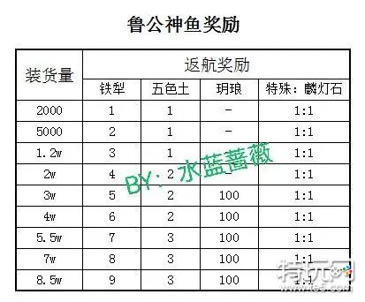 7、仙女湖四级,各个载重量与奖励对照如下图: