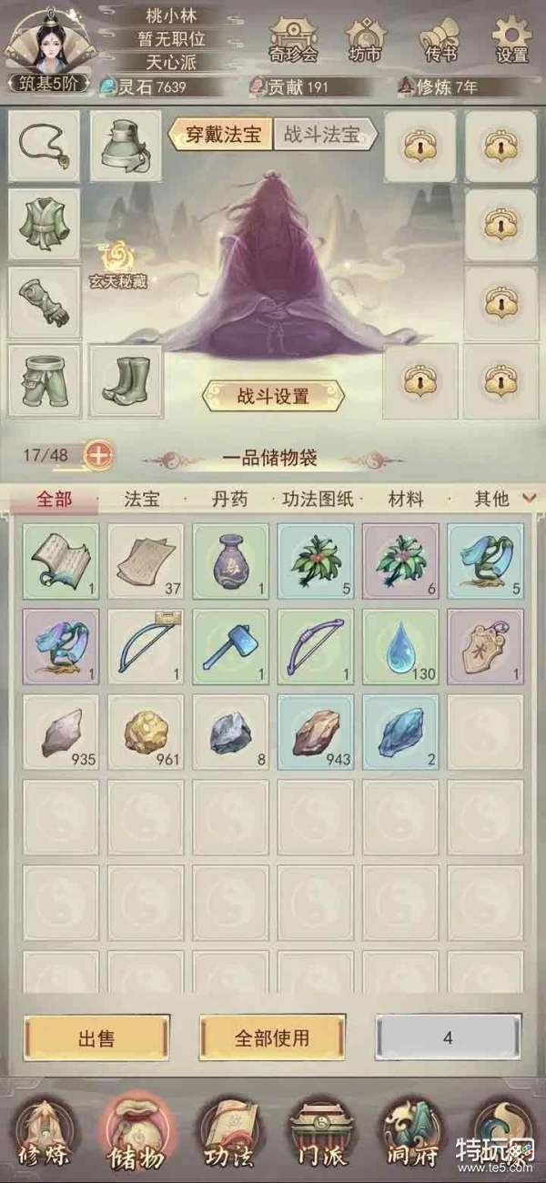 ④用赠送的资源升到7级聚灵阵,坊市—珍宝阁购买五行灵器并装到洞府聚灵阵上,然后安排仆役肉木互升,记得点满队列;